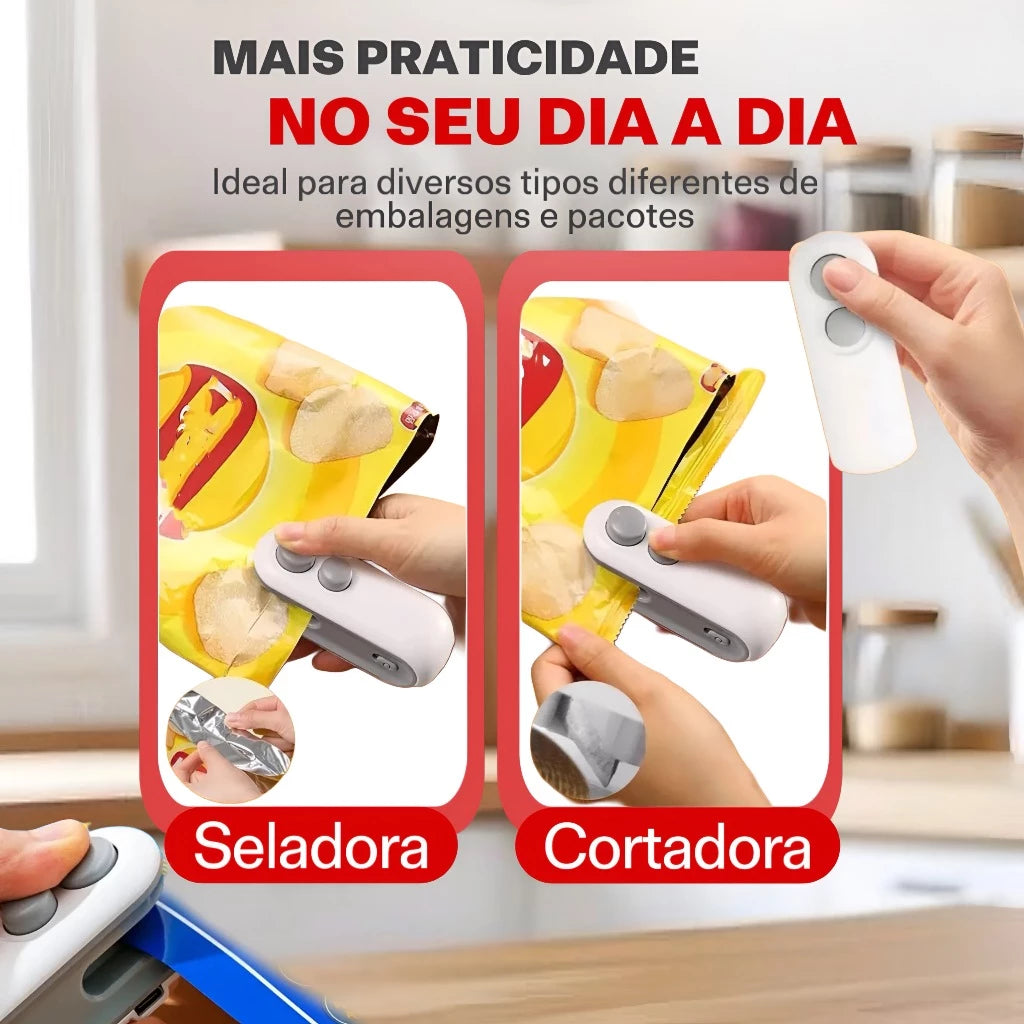- 2 em 1: Sela e corta sacos plásticos, oferecendo uma solução prática para manter alimentos frescos.